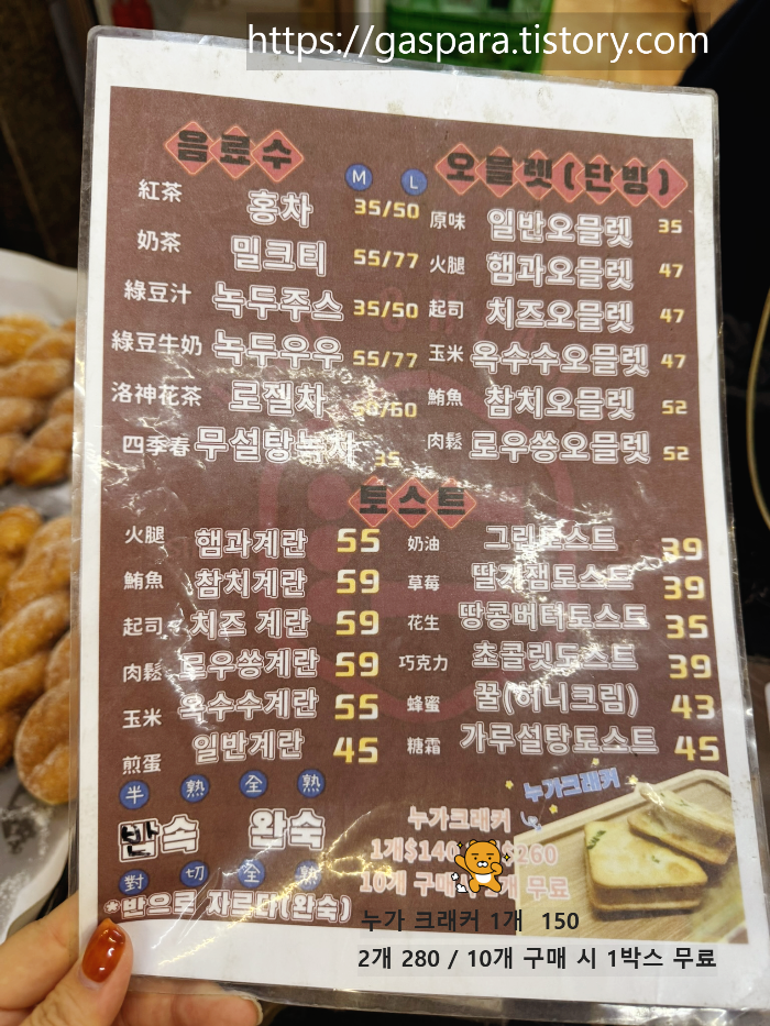 저는 늦은 오후에 방문한거라 딴삥은 못 먹었고 누가크래커를 포장하면서 햄&계란 토스트, 그리고 아이스 밀크티를 주문했습니다. 아, 주문이 어렵지 않냐고요? 직원분들이 한국인을 보면 바로 한국어 메뉴판을 건네줍니다. 부담 없이 편하게 주문이 가능 합니다.