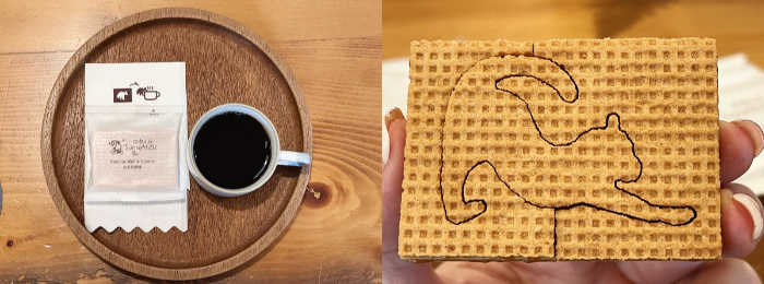평소엔 우롱차 + 펑리수 조합으로 시식을 했었는데 이번에는 커피와 바나나맛 와플을 선택해 보았습니다. 커피는 "8호 커피"라고 되어있었고, 고소하고 뒷맛이 깔끔해서 바나나 와플과 찰떡궁합이었습니다. 와플은 네모난 틀 안에 고양이 모양으로 만들어져 있어, 뽑기 하듯 분리하면서 먹는 재미가 있었습니다. 매장 판매코너에는 "5호 커피"도 있었는데 산미가 있는 타입이라 사과 펑리수와 잘 어울린다고 합니다.