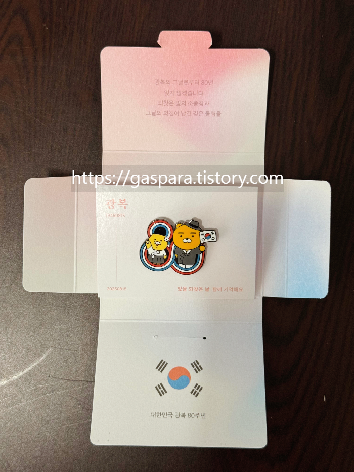 2025 춘식이 광복절 배지 지금 주문 가능!(8천 개 한정) 광복 80주년을 기념하는 춘식이 광복절 배지가 드디어 오늘부터 출시 됐다.지난 투표를 통해 결정된 최종 디자인은 라이언과 춘식이가 함께