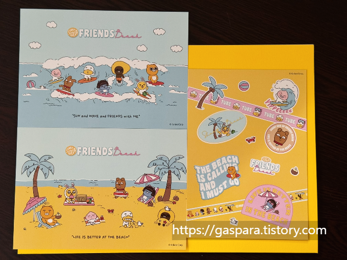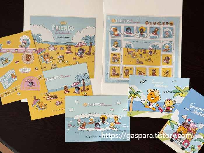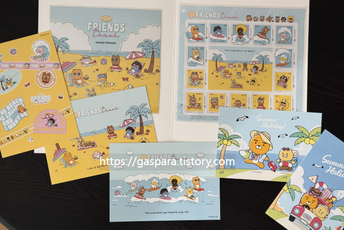 펼쳐보면 여름 느낌 뿜뿜한 카카오프렌즈 각 멤버들의 서핑 & 태닝 모습이 우표와 일러스트로 나와있다.